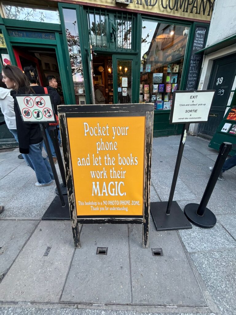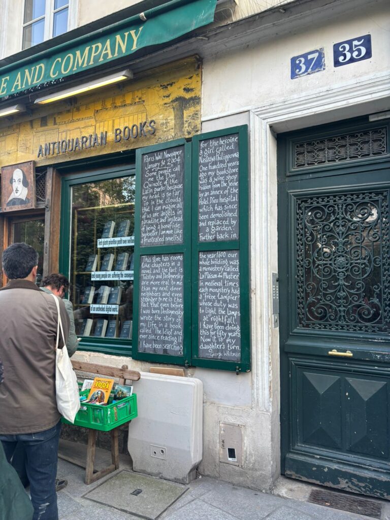 The narrow rooms of Shakespeare and Company seem to defy architectural logic. Stairs lead nowhere in particular, shelves overflow, and reading nooks appear unexpectedly between stacks of books. Quotes are scrawled across walls and staircases, reminding visitors to “be not inhospitable to strangers, lest they be angels in disguise.” It is a place designed for lingering, not browsing a deliberate resistance to speed and efficiency.