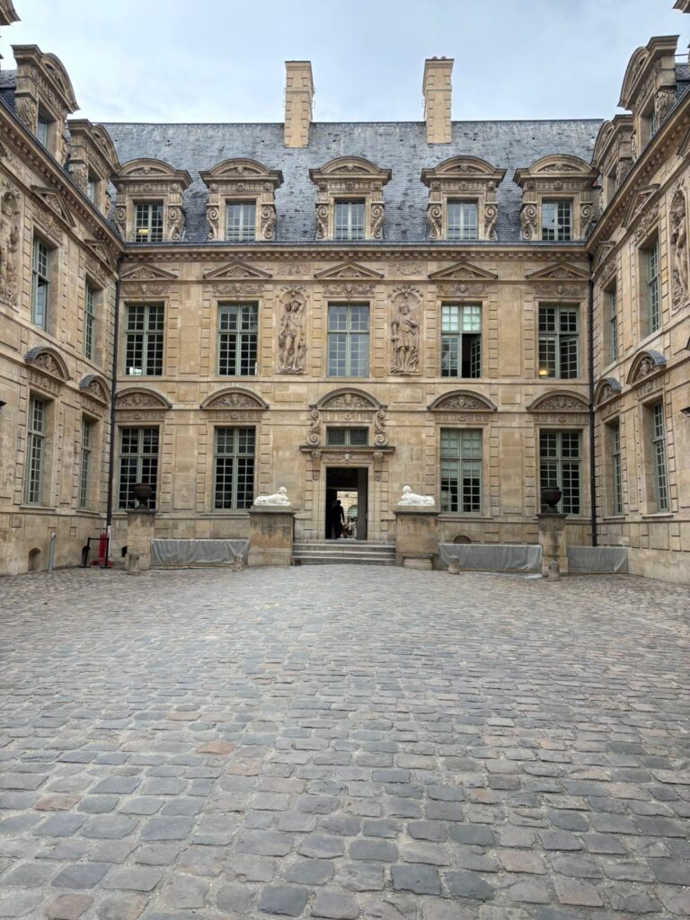 The approach itself feels ceremonial. Entering through a discreet portal on Rue Saint-Antoine, visitors pass into a cobbled courtyard framed by sculpted stone, classical columns, and ornamental reliefs. From here, a rare visual axis opens toward the Place des Vosges, linking private aristocratic life with one of Paris’s most celebrated public spaces.