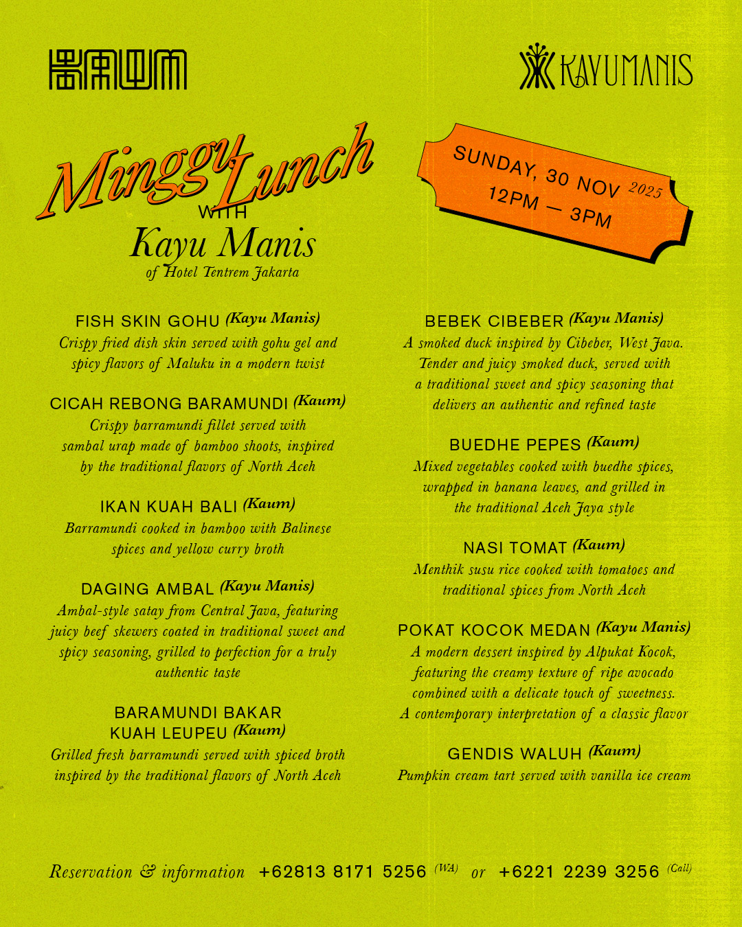 Kaum Jakarta proudly announces a special culinary collaboration with Kayu Manis, the signature Indonesian restaurant of Hotel Tentrem Jakarta, for an exclusive Minggu Lunch experience on Sunday, 30 November 2025. This one-day collaboration brings a refreshed weekend dining experience to Kaum, highlighting shared interpretations of Indonesian flavours through a co-created menu.