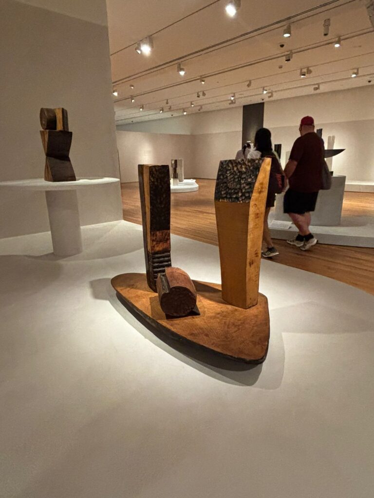 The exhibition brings together key sculptures, prints, archival materials, and rarely seen photographs, allowing viewers to witness the evolution of her thinking. Repetition, rhythm, and balance recur throughout her work, reflecting her interest in structure, meditation, and the physical experience of form in space. Materials such as stone, wood, and bronze are handled with quiet precision, inviting contemplation rather than spectacle.